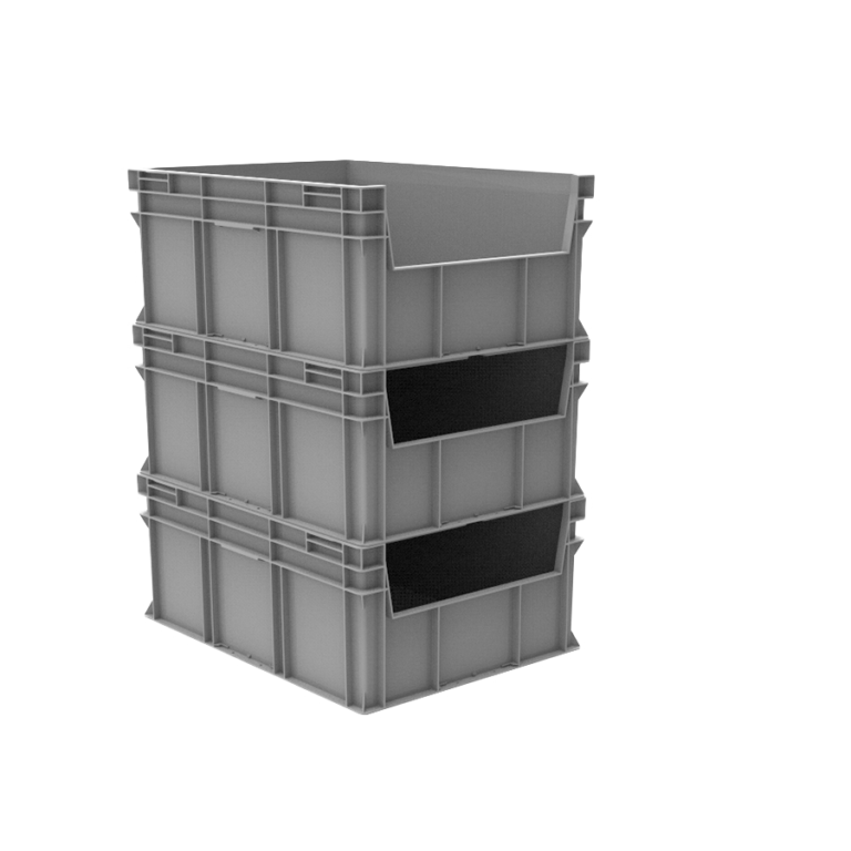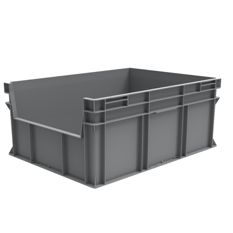 A linha Euro Forte customizada com abertura em um dos lados menores é muito prática. Caixa utilizada para sistema de picking na indústria em geral, pois facilita a carga/descarga automatizada do conteúdo.